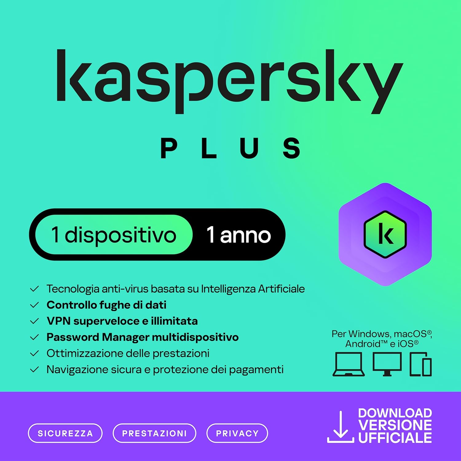 Kaspersky Plus offre protezione completa, prestazioni e privacy per un’esperienza online perfetta. La soluzione include una sicurezza informatica completa, strumenti di ottimizzazione del dispositivo e un’ampia gamma di funzionalità per la privacy, come la protezione dei pagamenti, la navigazione anonima e la gestione sicura delle password. Include anche l’accesso VPN illimitato, per rimanere anonimi durante la navigazione, la ricerca e l’accesso ai contenuti, sia su reti Wi-Fi pubbliche che private. La soluzione è compatibile con PC, macOS, Android e iOS.